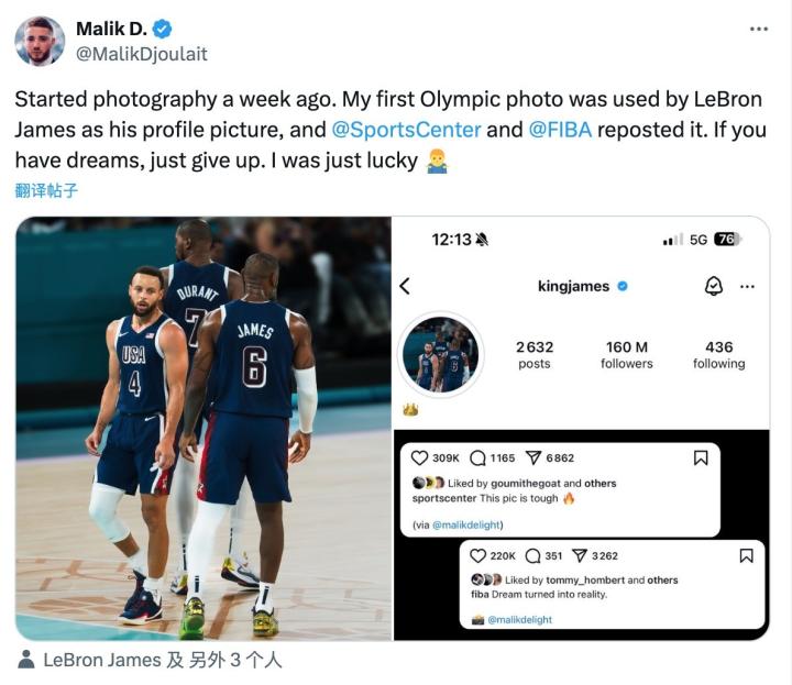 “一周前开始摄影。我的第一张奥运照片被勒布朗詹姆斯用作头像, 被SportsCenter和国际篮联转发了。如果你有梦想,就放弃吧,我只是运气好而已。”