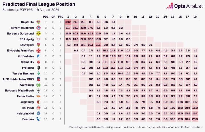 新赛季德甲将于周末打响,知名数据机构Opta预测了夺冠、前四名以及降级概率。勒沃库森是夺冠头号热门。