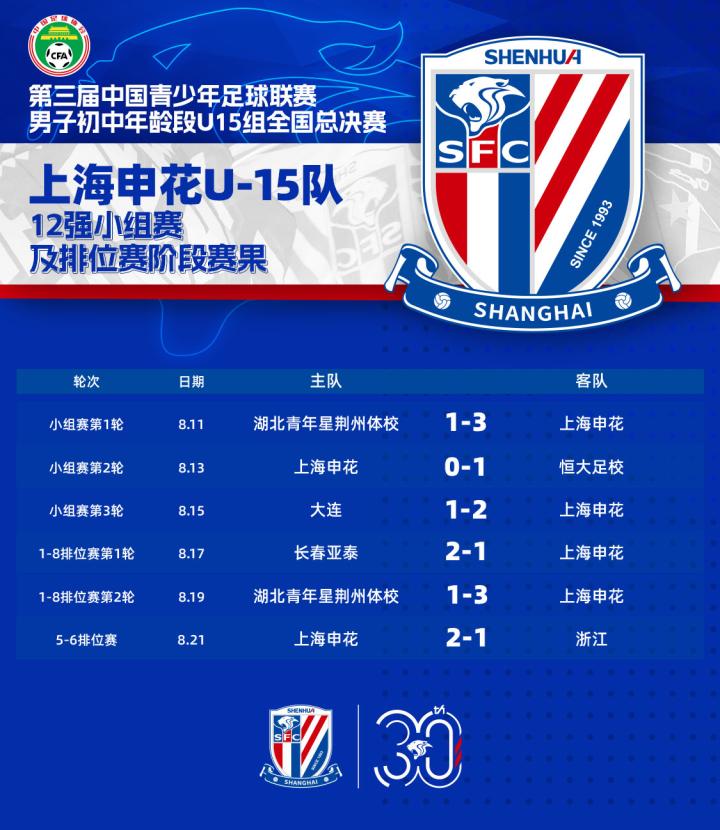 奋楫2024·申花青训|上海申花U15队获得2024中青联第五名上海申花足球俱乐部 @懂球帝2024-08-22 14:06奋楫2024·申花青训U15|上海申花U15队获得2024中青联第五名 8月21日下午,2024年第三届中国青少年足球联赛(男子初中年龄段U15组)全国总决赛5-6名排位赛在河北唐山南湖城市足球广场打响。凭借蒋廷远和敖翔的进球,由王佳翔指导率领的上海申花U15队2-1战胜浙江队U15队,最终位列本次赛事第五名。展开更多
