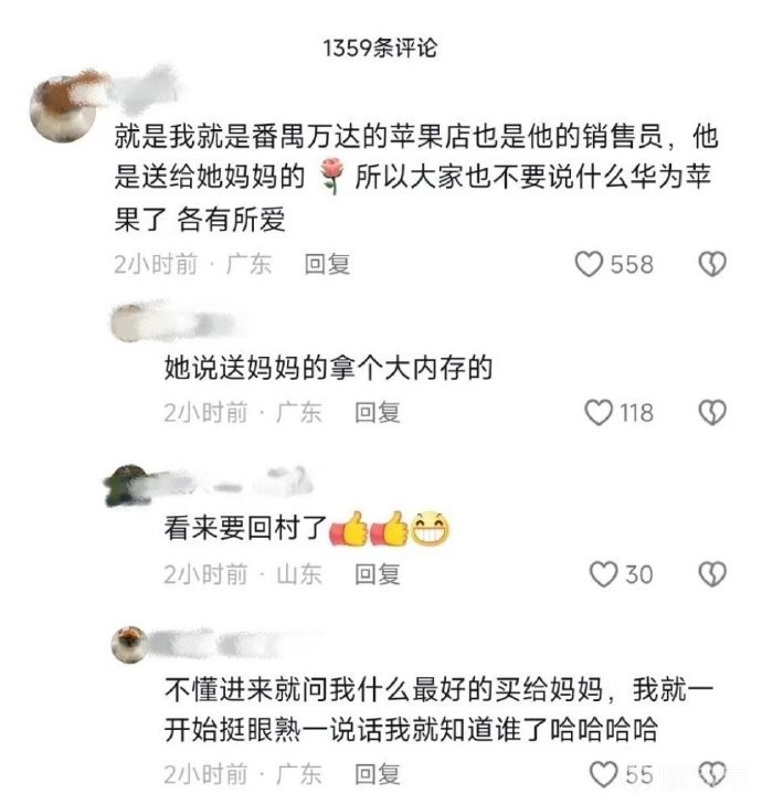 据博主“哎一股清流”整理,一名自称是番禺万达苹果手机店的店员表示是他在店里接待的全红婵,并且全红婵说要买个大内存的最好款式的手机送给妈妈。