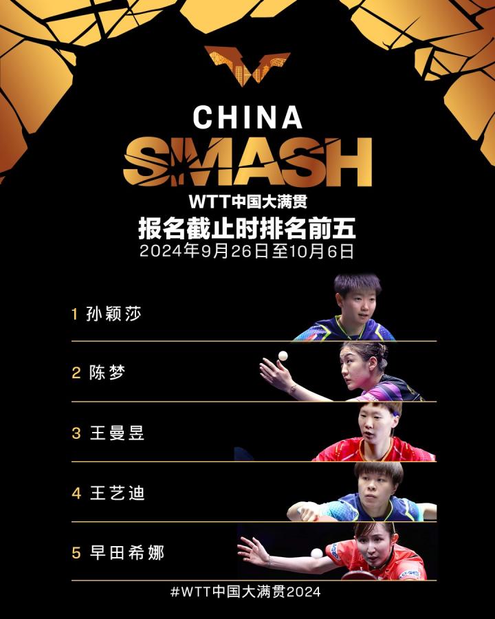 8月22日,世界乒联公布2024年WTT中国大满贯首批参赛名单,王楚钦和孙颖莎领衔。