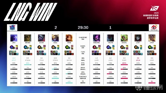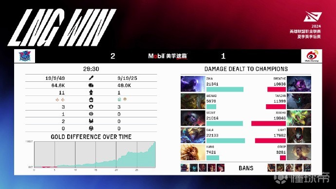 第29分钟,LNG大龙推进,在中路打出0换4拆掉WBG基地,LNG拿下赛点。