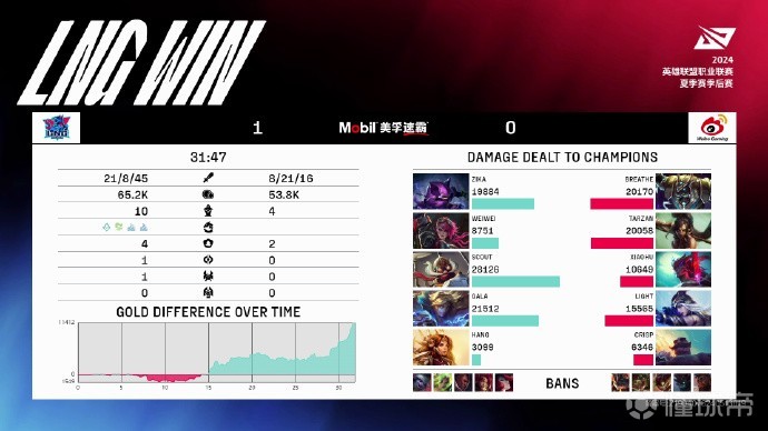 第31分钟,LNG双龙汇推进,GALA再收三杀,LNG团战1换5推平基地拿下首局。