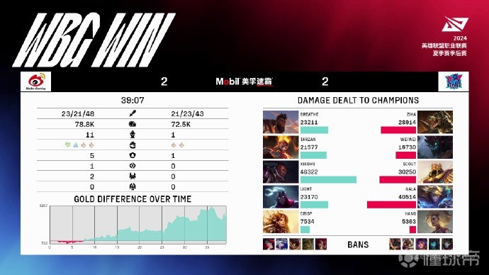 第39分钟,高地团战,WBG打出3换4再次扳平比方,双方来到决胜局。