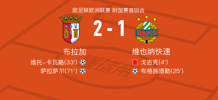 在欧足联欧洲联赛附加赛首回合的较量中,布拉加迎战维也纳快速。比赛一开始,维也纳快速的戈吉克被罚下场,给球队带来了不小的压力。尽管如此,维也纳快速依然率先打破僵局,马蒂亚斯-塞德尔助攻布格施塔勒成功破门。 布拉加迅速做出回应,萨拉萨尔送出精准传球,维托-卡瓦略将球送入网窝,双方战成平局。比赛进入下半场,布拉加继续施压,安德烈-奥尔塔助攻萨拉萨尔,再次攻破对方球门。 最终,布拉加以2-1战胜维也纳快速,在首回合比赛中占得先机。