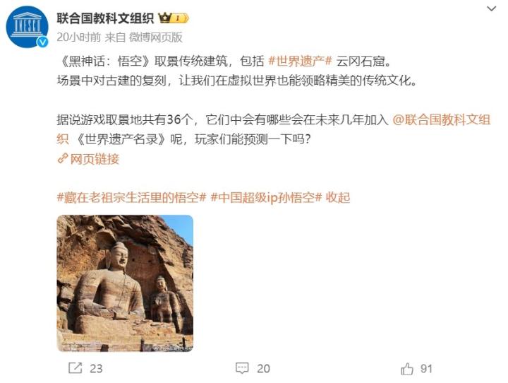 联合国教科文组织写道:《黑神话:悟空》取景传统建筑,包括世界遗产云冈石窟。