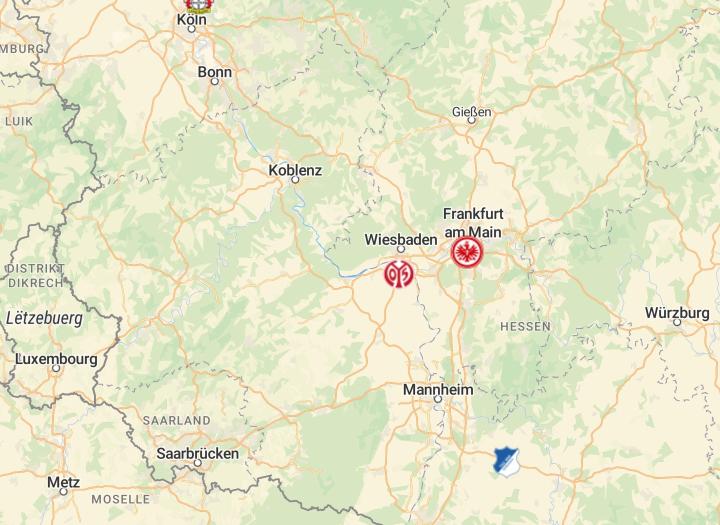 在北威州以南,巴符州以北,与法国和卢森堡接壤的是莱茵兰-普法尔茨州(简称莱普州),其首府是美因茨,有德甲的美因茨队。莱普州东侧紧邻着黑森州,黑森州人口最多的城市是法兰克福,有德甲的法兰克福队,法兰克福也是莱茵-美因大都会区的中心。