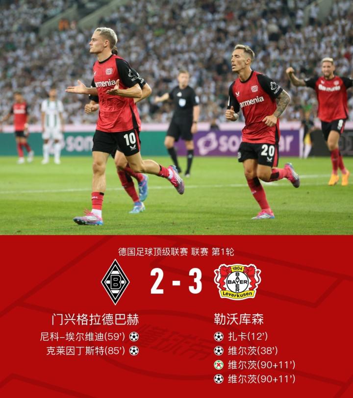 勒沃库森3-2门兴,维尔茨梅开二度+绝杀,扎卡世界波