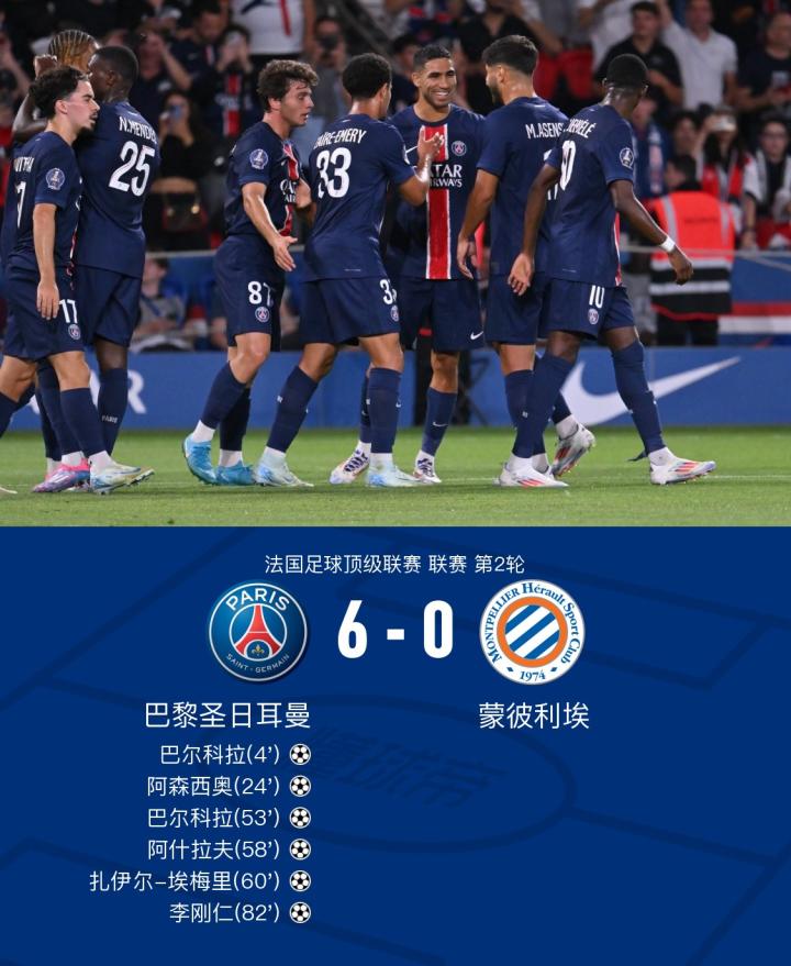 在法国足球顶级联赛第2轮的比赛中,巴黎圣日耳曼主场迎战蒙彼利埃。上半场,巴尔科拉闪击得分,随后阿森西奥扩大领先优势。下半场,登贝莱助攻,巴尔科拉再下一城。随后,阿什拉夫和埃梅里两分钟内接连攻破对手球门。终场前,李刚仁远射得分。全场比赛结束,巴黎主场6-0大胜蒙彼利埃。
