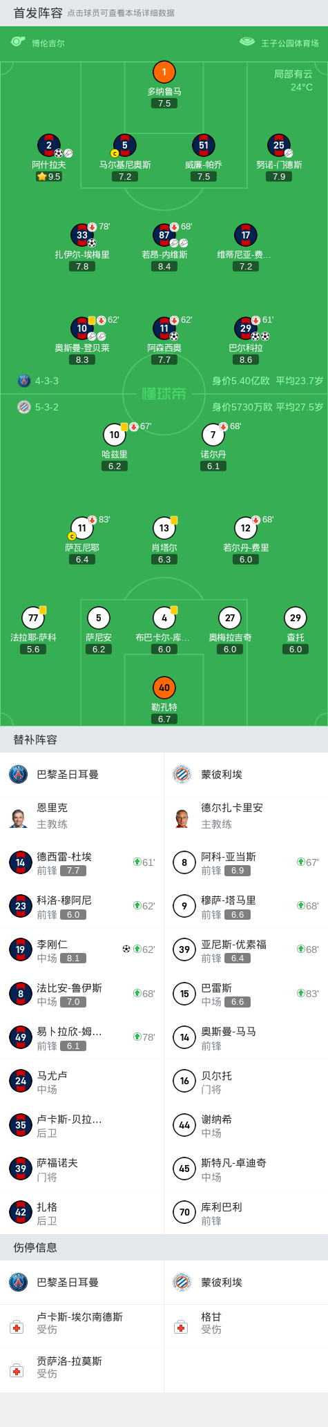 巴黎6-0大胜蒙彼利埃,巴尔科拉双响,阿森西奥、李刚仁破门