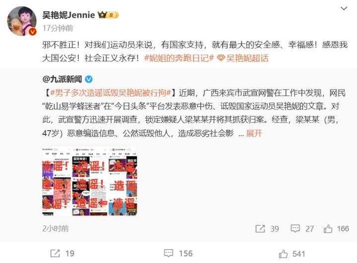 一男子多次造谣诋毁吴艳妮被行拘,运动员本人回应:邪不压正