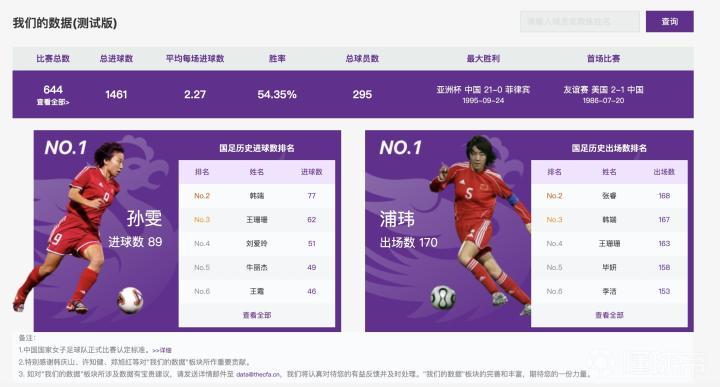 不过,由于女足的历史资料较少,可能存在缺失和错漏,因此足协也把这个数据标注为“测试版”。