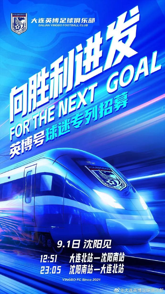 8月24日,据大连英博官方消息,为了方便广大英博球迷赴沈阳远征,在中国铁路沈阳局集团有限公司大连客运段大力支持下,英博号球迷专列将于9月1号启程,现招募商务座乘坐球迷。