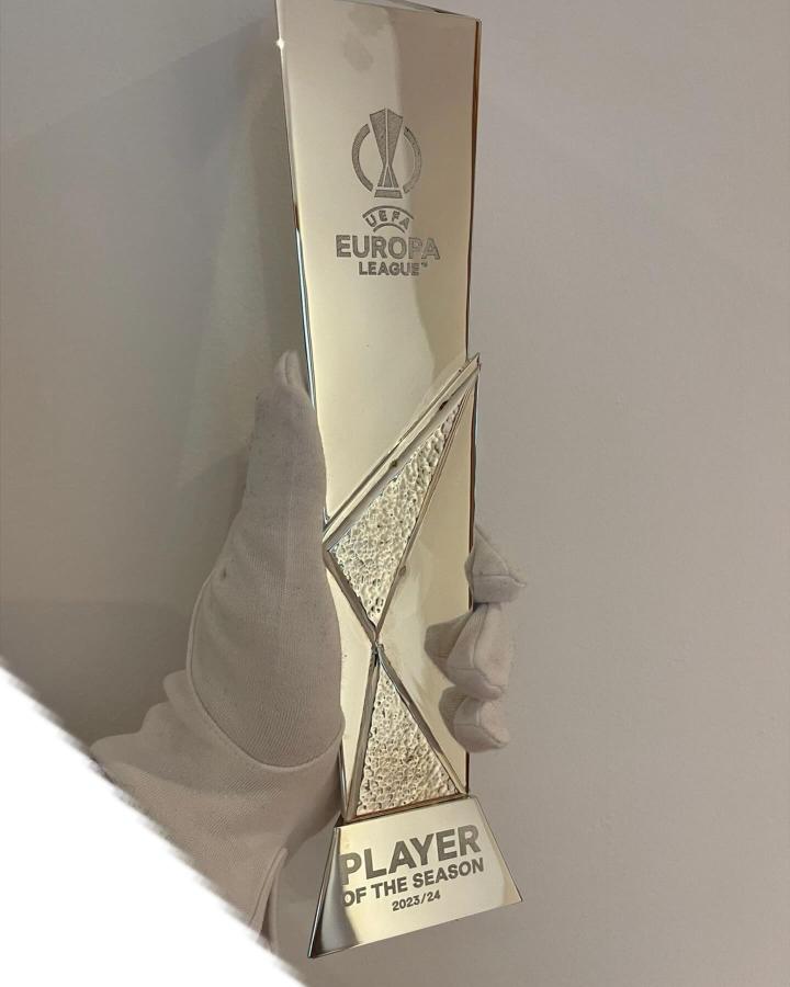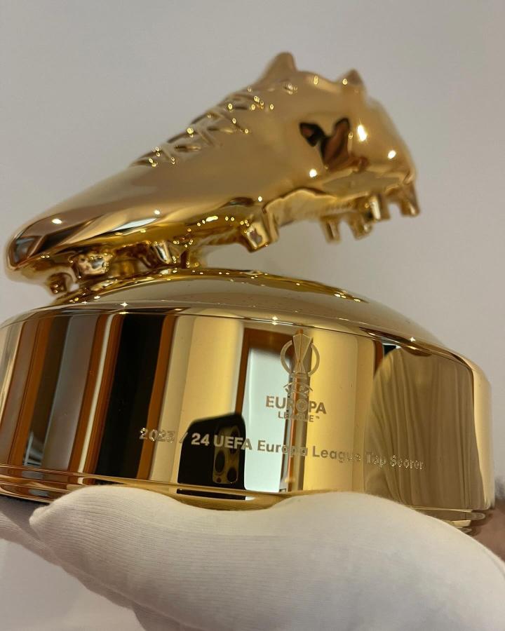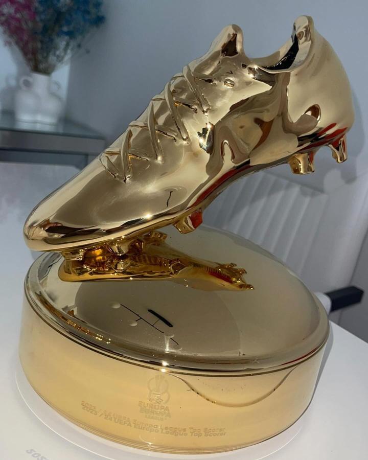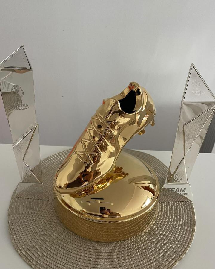 上赛季欧联杯金靴+最佳球员,奥巴梅扬晒欧足联寄给他的奖杯