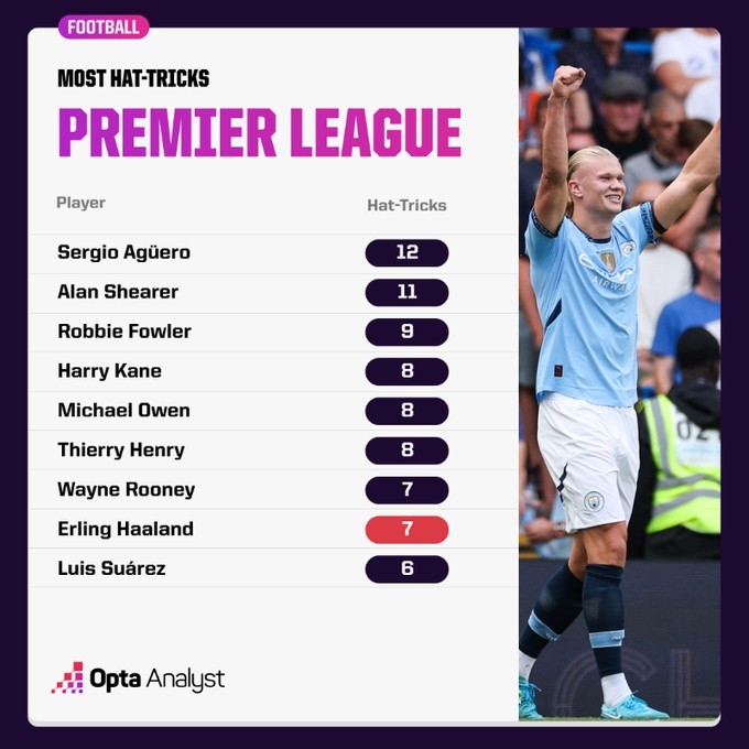 英超历史帽子戏法排行:阿圭罗12次居首,哈兰德7次升至第七