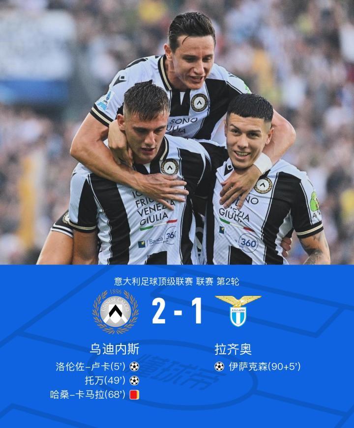 在意大利足球顶级联赛第2轮的比赛中,乌迪内斯主场迎战拉齐奥。上半场,托万传球到后点,洛伦佐-卢卡头球破门先拔头筹。下半场,托万中场持球奔袭,禁区内低射破门将比分扩大。补时最后阶段,伊萨克森补射破门扳回一分。最终乌迪内斯主场2-1战胜拉齐奥。