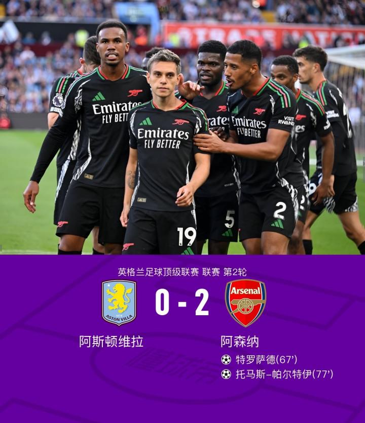 北京时间8月25日00:30,英超第2轮焦点战,阿斯顿维拉坐镇主场维拉公园球场迎战阿森纳,本场主裁判为迈克尔-奥利弗。上半场,萨卡内切打门被马丁内斯神勇化解,沃特金斯半空门打偏,罗杰斯表现活跃屡次一条龙造险。下半场,沃特金斯近距离头球补射被拉亚神扑拒绝,特罗萨德替补登场闪电破门,托马斯远射建功。最终,阿森纳2-0客胜维拉。