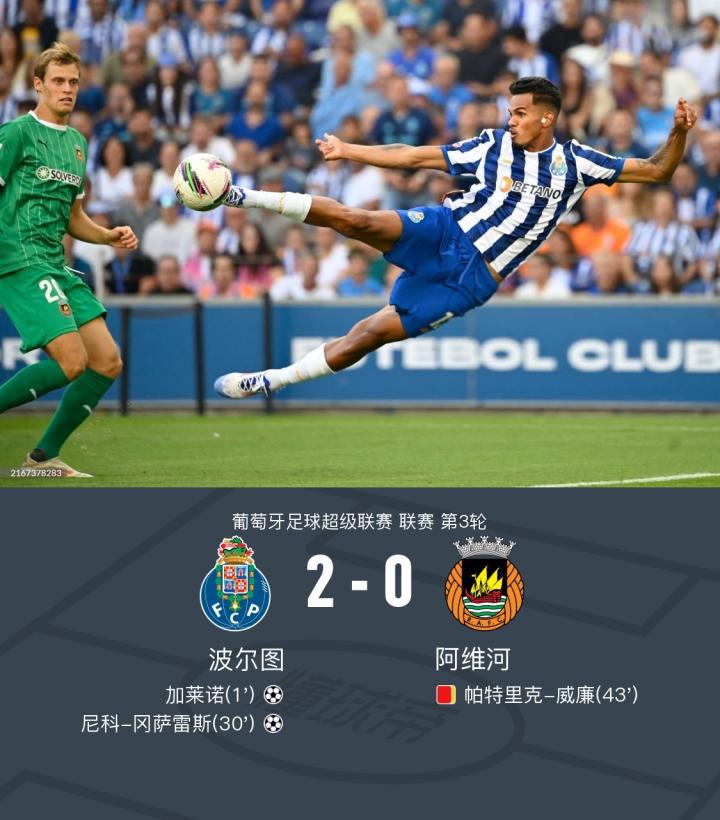 波尔图2-0阿维河葡超3连胜,加莱诺建功,尼科-冈萨雷斯破门
