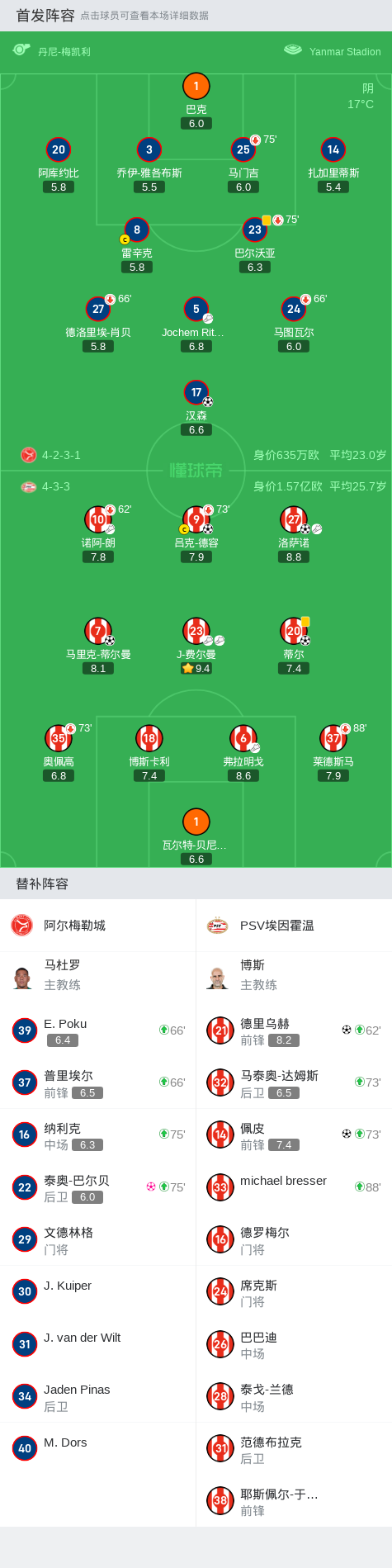 第15分钟,PSV埃因霍温球员J-费尔曼助攻吕克-德容打入一球。