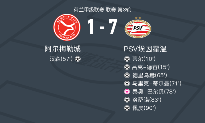 北京时间8月25日,荷兰甲级联赛第3轮,阿尔梅勒城主场迎战PSV埃因霍温。比赛中,阿尔梅勒城的汉森成功破门,而泰奥-巴尔贝不幸自摆乌龙。PSV埃因霍温方面,蒂尔、吕克-德容、德里乌赫、马里克-蒂尔曼、洛萨诺和佩皮各自建功。最终,阿尔梅勒城以1比7不敌PSV埃因霍温。