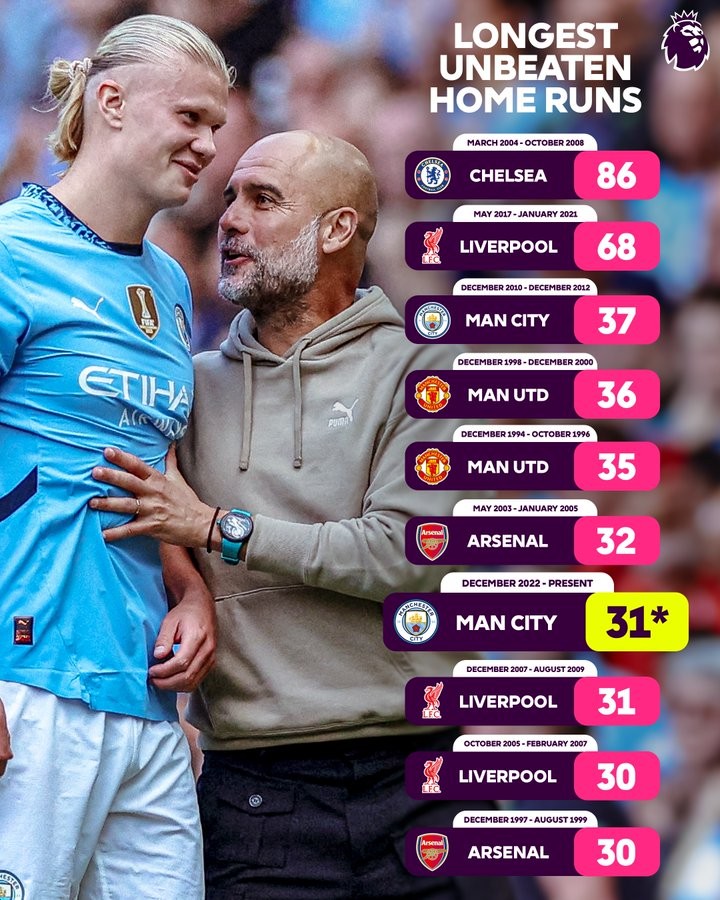 值得一提的是,这项纪录排在第三位的也是曼城自己,他们曾在2010年12月至2012年12月创下了37个英超主场不败的傲人战绩。排在这一榜单首位的是2004年3月至2008年10月的切尔西,86个英超主场不败。