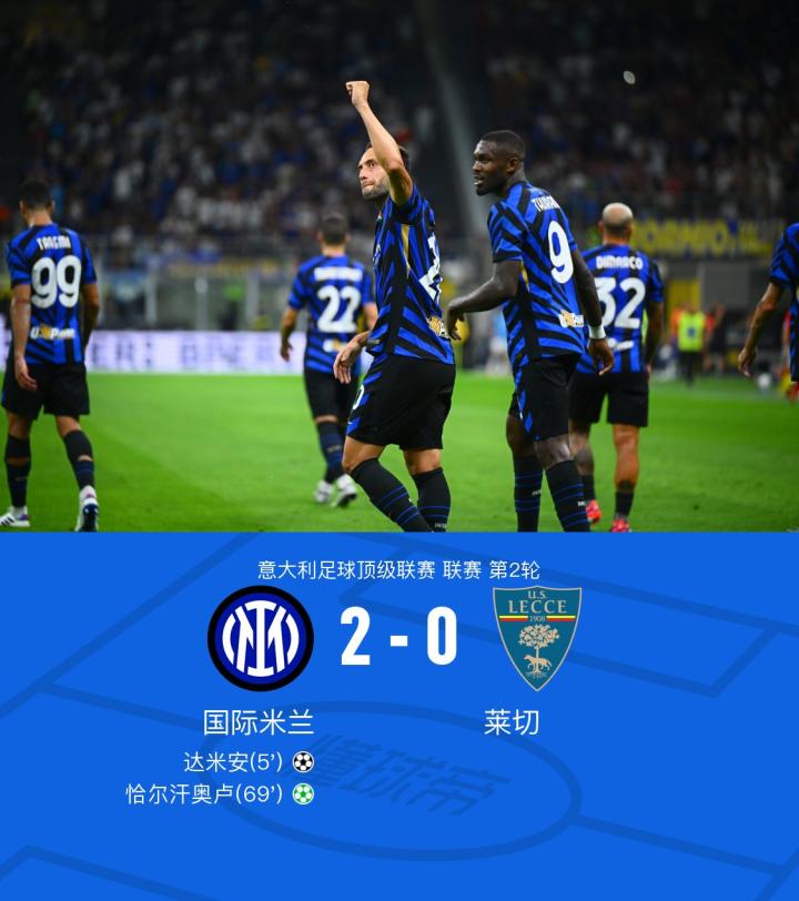 在意大利足球顶级联赛第2轮的比赛中,国际米兰坐镇主场迎战莱切。上半场,塔雷米助攻,达米安建功。下半场,图拉姆造点,恰尔汗奥卢主罚命中。全场比赛结束,国米主场2-0战胜莱切,取得新赛季意甲联赛首胜。