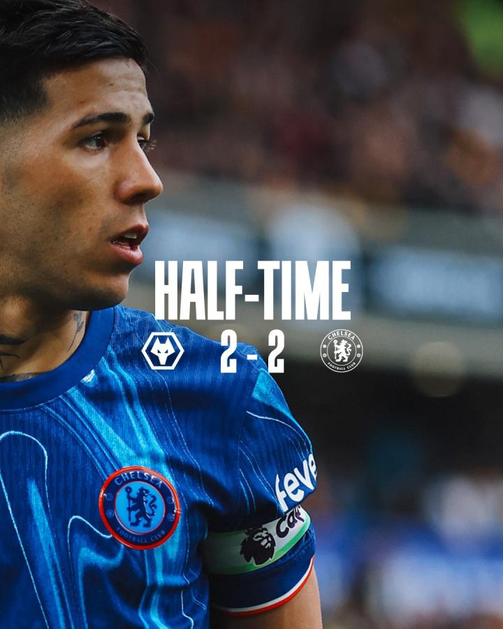 在上半场的比赛中,尼古拉-雅克松帮助切尔西首开记录,随后狼队前锋库尼亚破门扳平比分。帕尔默打入精彩进球帮助切尔西2-1再度领先,但是在上半场结束前,拉森破门帮助狼队再度扳平比分。
