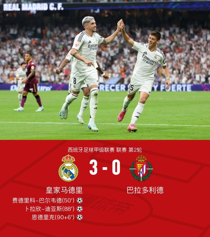 在西班牙足球甲级联赛第2轮的比赛中,皇家马德里主场迎战巴拉多利德。第50分钟,费德里科-巴尔韦德远射破僵,第88分钟,卜拉欣-迪亚斯接吊射扩大领先优势,补时最后时刻,恩德里克抽射得分。 最终,皇家马德里以3-0完胜巴拉多利德,取得了一场酣畅淋漓的胜利。