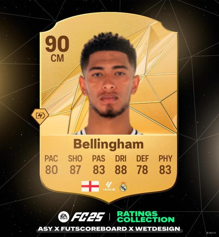 FC25贝林厄姆能力值遭到泄露,90总评+80速度+87射门+88盘带+83传球+78防守+83身体+金电池。