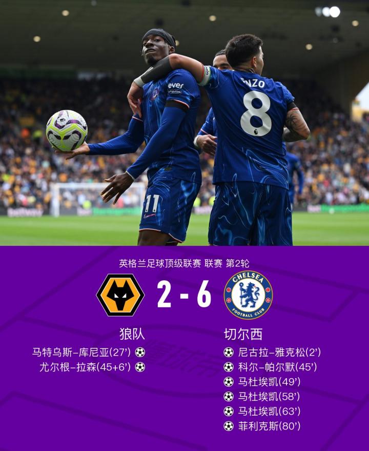 【切尔西客场6-2狼队,马杜埃凯戴帽,帕尔默造4球,雅克松传射】