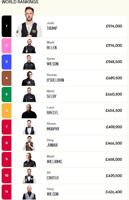 西安大奖赛夺冠的凯伦-威尔逊依然排名第三,但他获得177,000英镑奖金,与特鲁姆普和艾伦的差距缩小到2.55万英镑,罗尼-奥沙利文打入西安大奖赛四强,排名上升一位至第四。