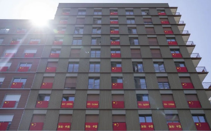 加油中国!巴黎残奥村中国体育代表团的公寓外墙挂满了五星红旗