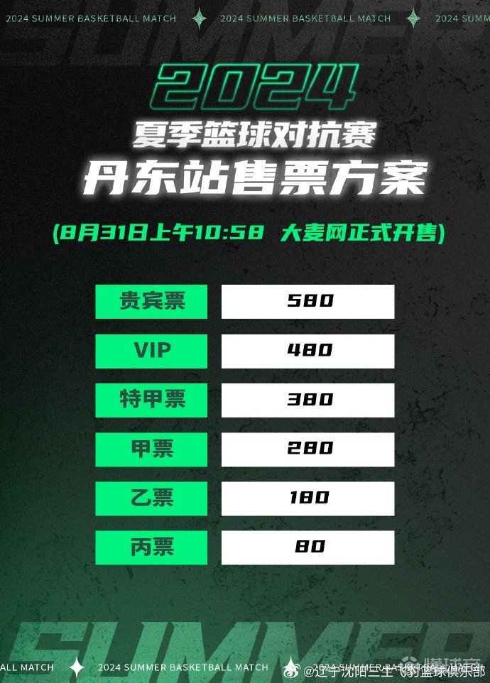 据辽宁沈阳三生飞豹篮球俱乐部官方社媒平台消息,“宽甸文旅杯”2024夏季篮球对抗赛(丹东站)比赛门票31日10时58分大麦网开售。