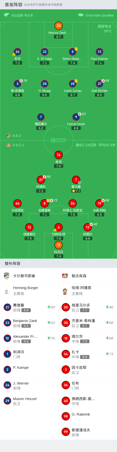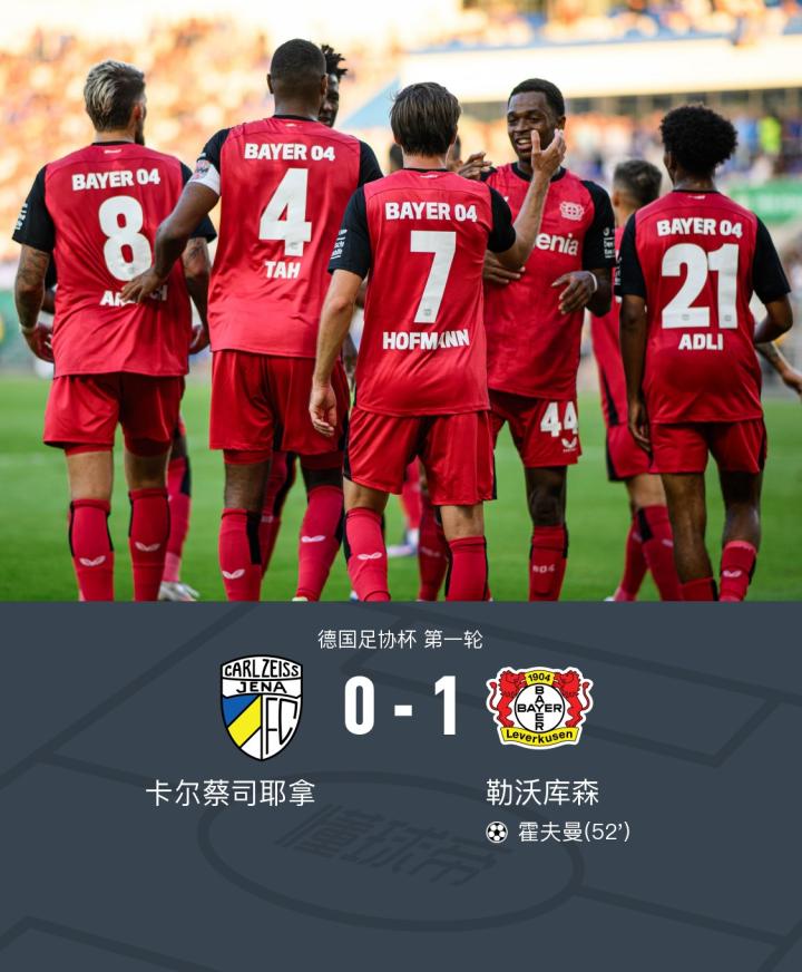 在德国足协杯第一轮的较量中,卡尔蔡斯耶拿迎战勒沃库森。上半场双方互交白卷,勒沃库森占据场上优势,阿德里内切射门击中立柱。下半场,格里马尔多助攻,霍夫曼头球破门改写比分。最终勒沃库森客场1-0战胜卡尔蔡司耶拿,顺利挺进下一轮。