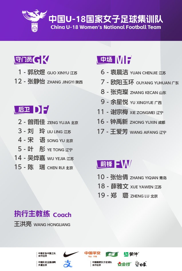中国队出场阵容:1-郭欣煜、2-曾雨佳(16-钟禹新-55’)、3-刘玲(5-叶彤-68’)、4-宋语、6-袁晨洁、7-欧阳玉环、8-张克璨(18-薛雅文-60’)、10-张怡倩(9-余星悦-68’)、11-谢宗梅(17-王爱芳-41’)、15-陈瑞、19-郑璐(14-吴烨嘉-55’)