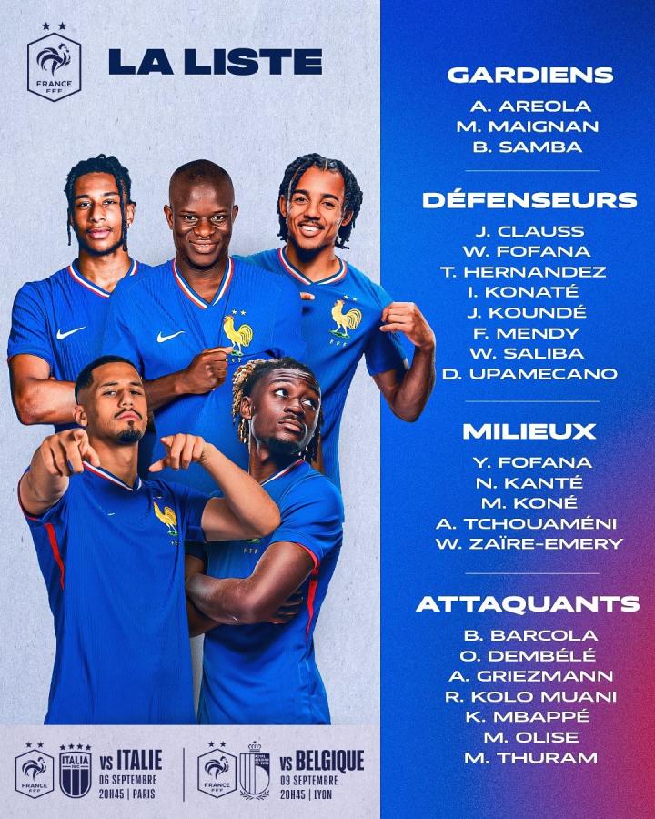 在九月的国际比赛日中,法国将在欧国联中对阵意大利和比利时。