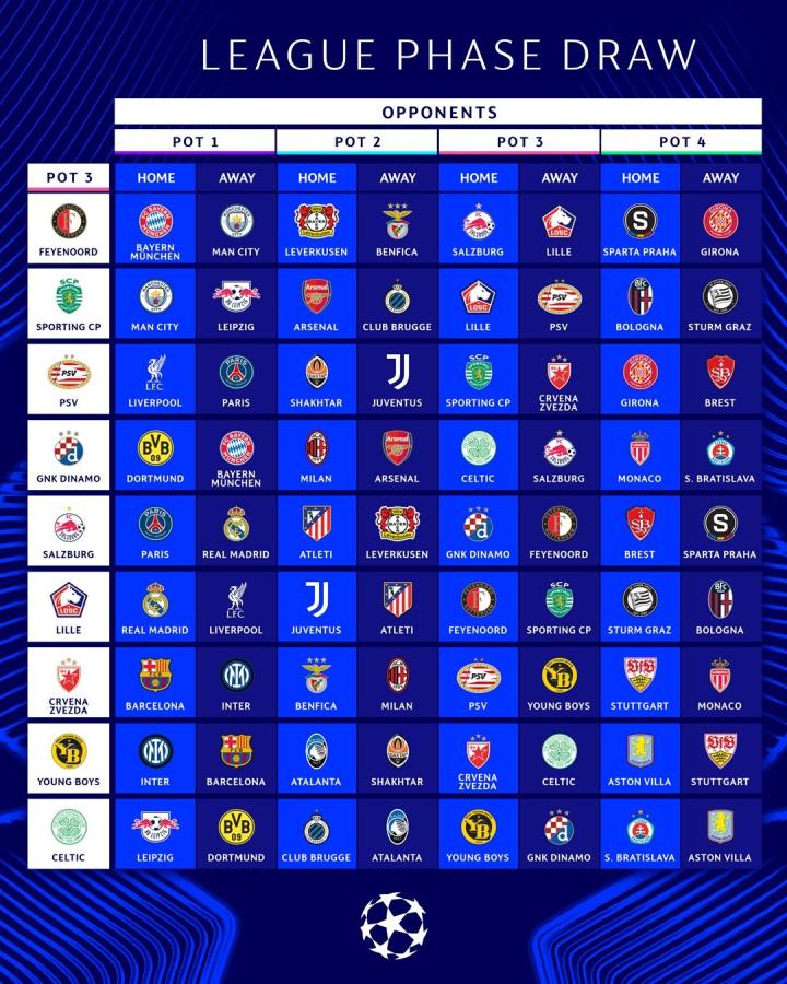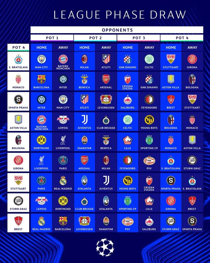 北京时间8月30日,欧足联进行了2024/25赛季欧冠联赛阶段的抽签,所有参赛球队的全部对手均得到确认。