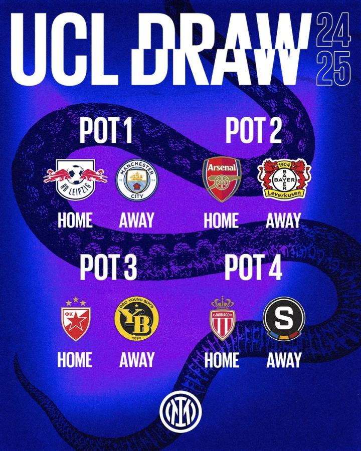 国米欧冠联赛阶段对手:曼城、阿森纳、勒沃库森在列