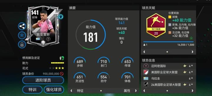 苏亚雷斯是乌拉圭足坛最伟大的前锋之一。天赋方面,美职联苏亚雷斯配备了强力锋霸,对他的加速、射门、抢点、头球、力量五项数据提升显著。花式方面,三星花式星级搭配马赛回旋,这样的配置让苏亚雷斯的前场盘带表现更加稳定。