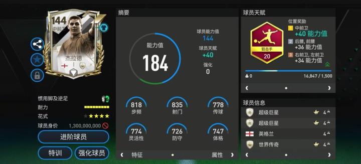 杰拉德是利物浦的功勋队长,更是英格兰最伟大的中场之一。美职联杰拉德配备了狙击手天赋,对他的加速、射门、抢点、远射、盘带五项数据提升显著。花式方面,高级油炸丸子搭配四星花式星级让杰拉德中场控球以及盘带表现有进一步增强。