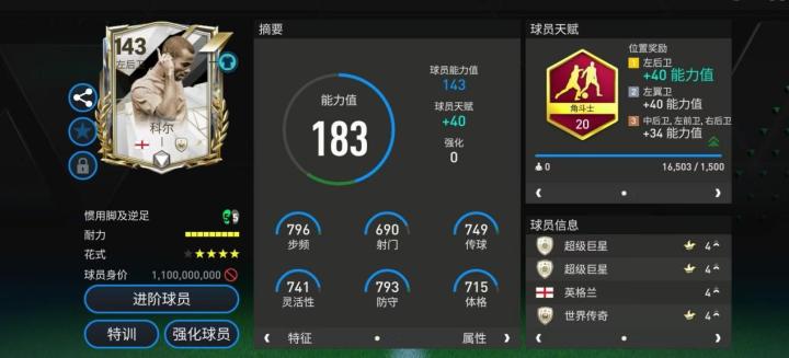 科尔是英格兰队史最伟大的一名边后卫,巅峰期的他更是被称为唯一一个能单防C罗的男人。美职联科尔配备了角斗士天赋,对他攻守两端的多项数据都有提升。花式方面,四星花式星级结合高级油炸丸子让他的持球能力足以媲美边锋。