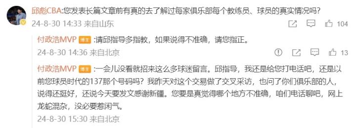 一会儿没看就招来这么多球迷留言。邱指导,我还是给您打电话吧,还是以前您球员时代的137那个号码吗?我昨天对这个交易做了交叉采访,也问了你们俱乐部的人,说得还挺好,还说今天要发文感谢新疆。您要是真觉得哪个地方不准确,咱们电话聊吧,网上龙蛇混杂,没必要惹闲气。”