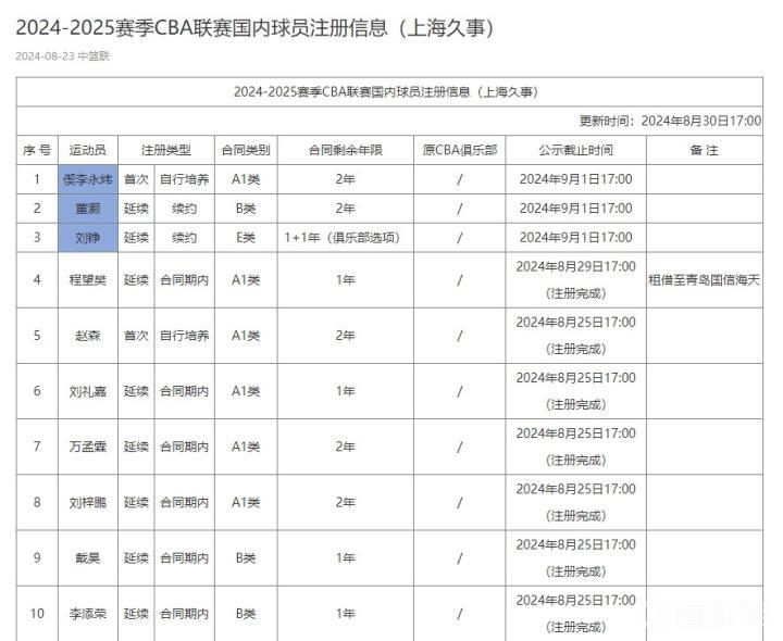 8月30日,CBA官网更新球员注册信息,上海男篮提交最新国内球员注册表。