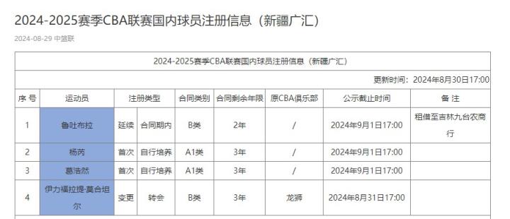 新疆男篮注册名单:鲁吐布拉租借至吉林,杨芮葛浩然升上一队凡尔赛小木屋 @懂球帝2024-08-30 20:228月30日,CBA官网更新球员注册信息,新疆男篮提交国内球员注册表。其中,鲁吐布拉2年B类合同续约,目前已被租借至吉林男篮,上赛季被新疆男篮交易至广州男篮的伊力福拉提回归球队,他的B类合同还有3年。此外,两位年轻球员杨芮和葛浩然升入一队,分别签下3年A1类合同。展开更多