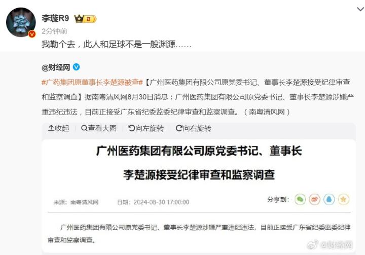 在李楚源接受纪律审查和监察调查的消息爆出后,媒体人李璇表示:“我勒个去,此人和足球不是一般渊源……”