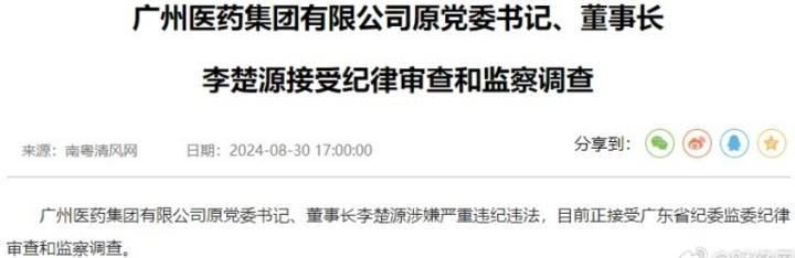 8月30日,据南粤清风网(广东省纪委省监察厅的综合性政务门户网站)的消息,广州医药集团有限公司原党委书记、董事长李楚源涉嫌严重违纪违法,目前正接受广东省纪委监委纪律审查和监察调查。