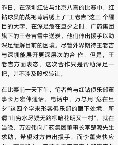 另外,记者程文莉表示:“大概十多年前,广州广药是广州恒大的前身,球队主场设在越秀山,当时球场四周摆满了广药旗下企业的广告牌,‘王老吉’凉茶就是广药的招牌产品。翻出十年前写的一篇稿子,是关于王老吉雪中送炭,赞助遭遇严重财务困境的深圳红钻。因此,深圳红钻球衣背后也出现过‘王老吉’三个大字。今非昔比,不管是恒大还是恒大的前身,这些曾经在中国足坛风头甚劲的行业巨头都经不起时间的考验,十年就塌方了,高管都被查了。”