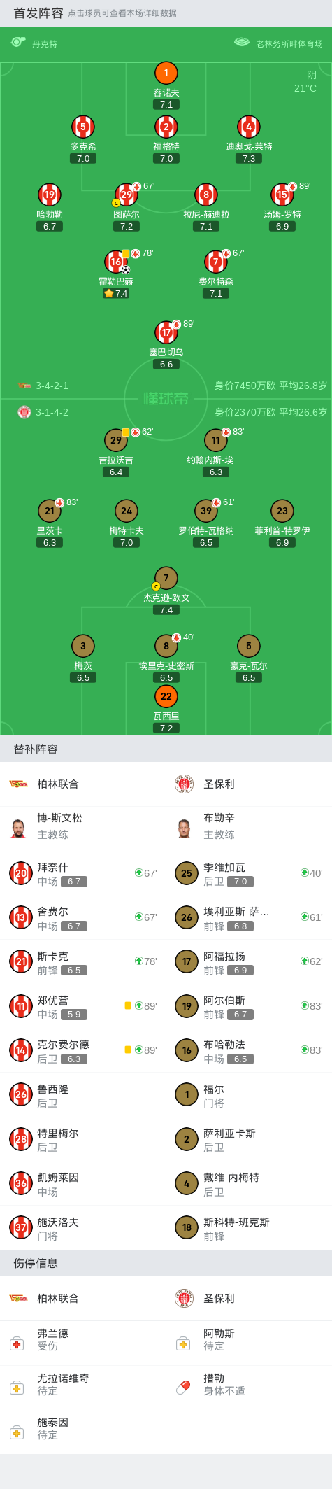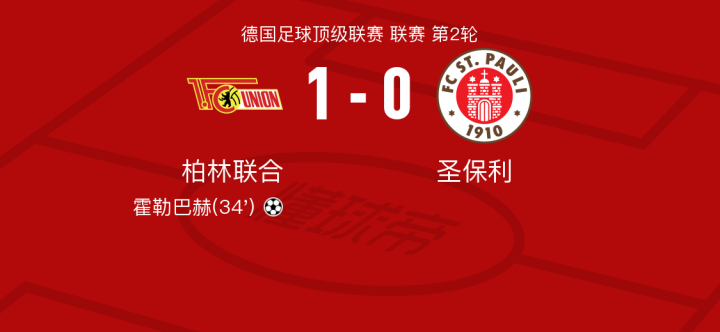 柏林联合1-0圣保利,霍勒巴赫一击制胜战报bot @懂球帝2024-08-31 04:22在德国足球顶级联赛第2轮的比赛中,柏林联合坐镇主场迎战圣保利。比赛中,柏林联合的霍勒巴赫成功破门,帮助球队取得领先。最终,柏林联合以1-0战胜圣保利,取得了宝贵的胜利。点击查看本场比赛详细数据>>点击查看德甲完整积分榜>>精彩瞬间第34分钟,柏林联合球员霍勒巴赫打入一球。 球队阵容 技术统计 展开更多