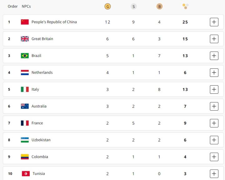前两个比赛日过后,中国残奥代表团以12金9银4铜位列奖牌榜首位,英国、巴西分列二三。