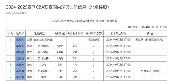 2024年8月,经我俱乐部与四川蓝鲸篮球俱乐部(以下简称四川俱乐部)及朱松玮本人友好协商后达成一致,并报CBA公司审核通过,原四川俱乐部球员朱松玮已在我俱乐部完成预注册,自2024-2025赛季开始,代表北控男篮征战CBA联赛。